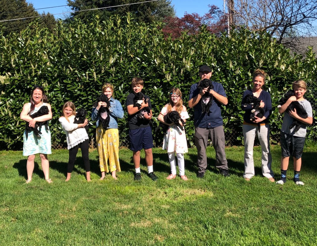 3 years ago my neighbor, Chris, told me I should get a female Goldendoodle and breed her with his Bernese, SamWise. I thought, well, why not, That would be fun and challenging. So I did a lot of research and found Lainey from a local breeder. 2 years have gone by and we are enjoying our first litter. My daughter and I are in this together and we have so much fun working together and loving these precious babies. With Chris and his family being here and help delivering the pups, as well playing with the puppies and socializing them daily – it’s a fun family adventure that we all love.